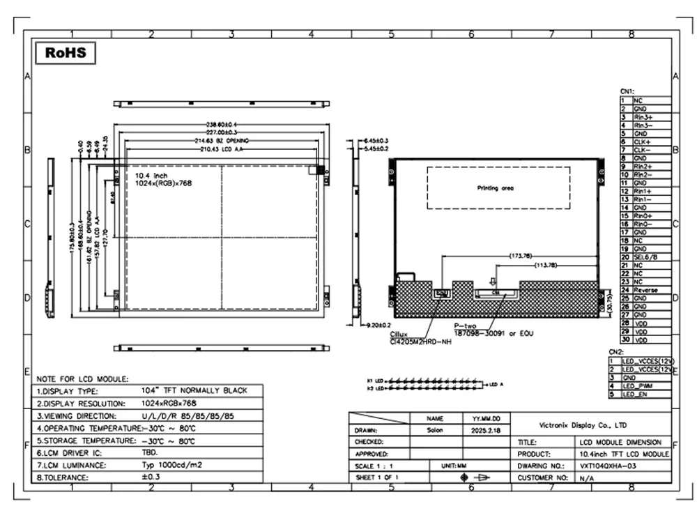 Ez a VicTronix 10,4 hüvelykes 1024 × 768 LVDS High Gightness TFT modul egy nagy teljesítményű 10,4 hüvelykes TFT-LCD modul, amelyet az ipari környezetben való megbízhatóság érdekében terveztek. A 1024 × 768 felbontással és 16,7 millió színű IPS panelgel kivételes vizuális tisztaságot biztosít, széles látószögekkel, 85 ° (3/6/9/12 órakor). Emellett 1000 CD/m² magas fényerőt, 1000: 1 kontrasztarányt és 80% -os egységességet kínál a közvetlen napfényben történő tiszta megtekintéshez. A Kínában a TFT modulok szakmai gyártójaként és szállítójaként ez a Victronix 10,4 hüvelykes TFT modul teljes mértékben megfelel a ROHS környezetvédelmi előírásainak, biztosítva a kiváló alkalmazás teljesítményét. Testreszabott szolgáltatást kínálunk ügyfeleink igényeinek kielégítésére.