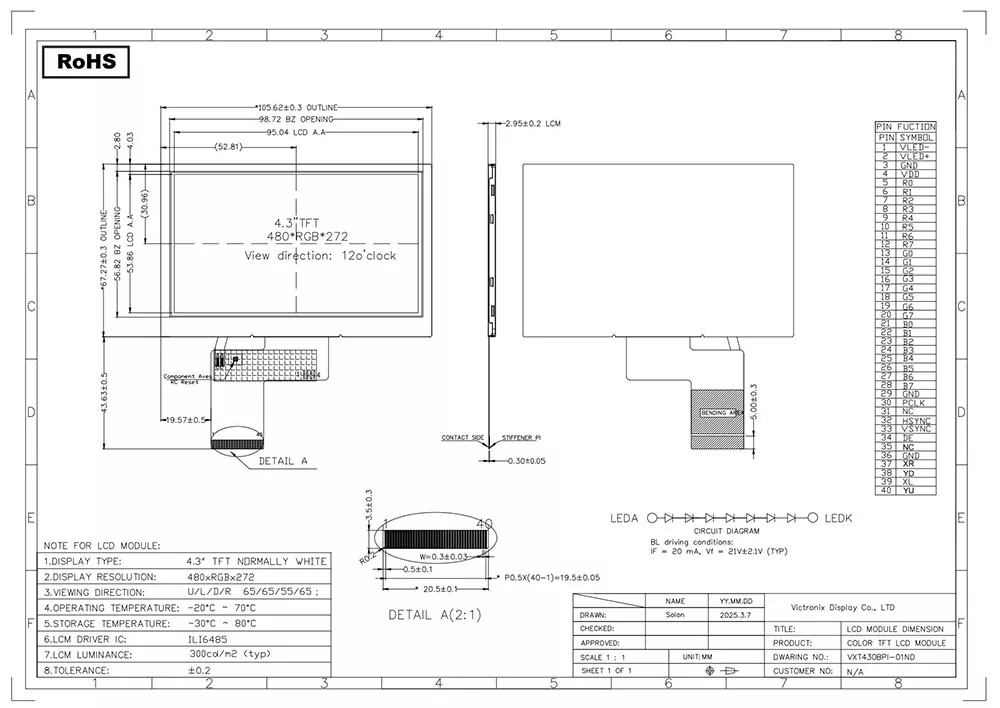 A TFT LCD egyfajta folyadékkristály kijelző, amely vékonyréteg-tranzisztor technológiát használ a képminőség javítására, és számos alkalmazással rendelkezik a mindennapi életben. Professzionális TFT modulgyártóként és beszállítójaként Kínában mi teszi a Victronix 4,3 hüvelykes 480 × 272 ipari TFT modulját a többi gyártótól? Először is, tipikus 300cd/m² fényerőt kínál, széles látószöget 65 ° -kal a 12 órás irányban, és a kontrasztarány 700: 1, biztosítva a kiváló olvashatóságot különböző szögekből. Másodszor, integrál egy háttérvilágítást, amely 7S1P-fehér LED-eket használ, tipikus élettartammal 30 000–50 000 óra (a kezdeti fényerővel), biztosítva a világítási körülmények között egyértelmű láthatóságot. Ezenkívül támogatja az ILI6485 vezérlővel ellátott RGB felületet. Ezenkívül szigorú környezeti vizsgálatot végez, beleértve a termikus sokkot (-30 ° C ↔ +80 ° C ciklusokat), a páratartalom tárolását (60 ° C/90% RH) és a mechanikus rezgést, biztosítva, hogy zökkenőmentesen működjön a meghosszabbított hőmérsékleti tartományon (-20 ° C- +70 ° C).