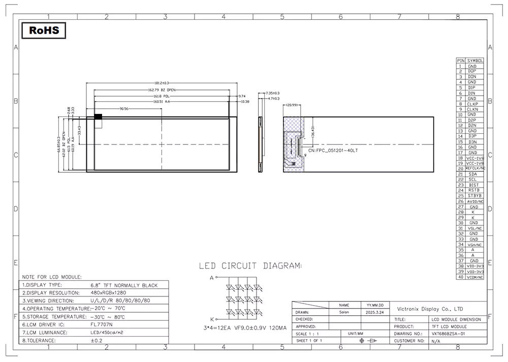 A TFT LCD egyfajta folyadékkristály kijelző, amely vékonyréteg-tranzisztor technológiát használ a képminőség javítására, és számos alkalmazással rendelkezik a mindennapi életben. Professzionális TFT modulgyártóként és szállítójaként Kínában mi teszi a Victronix 6,86 hüvelyk 480 × 1280 IPS TFT modulját, amely különbözik a többi gyártótól? Eleinte tipikus fényességet kínál 450 cd/m², 16,7 m színű, széles látószög 80 ° (tipikus) minden irányban, és a kontrasztarány 800: 1, biztosítva a kiváló olvashatóságot különböző szögekből. Másodszor, integrálja a háttérvilágítást, amely 3 × 4 fehér LED -eket használ, tipikus élettartammal 30 000–50 000 óra (a kezdeti fényerővel), biztosítva a világítási körülmények között világos láthatóságot. Emellett egy 4-sávos MIPI DSI felületet használ a nagysebességű adatátvitelhez és az egyszerűsített integrációhoz. Ezen túlmenően szigorú környezeti vizsgálatokat végez, ideértve a magas/alacsony hőmérsékleten történő tárolást és működést, a hőmérsékleti ciklus, a nedves hő (páratartalom) tesztelését, hogy zökkenőmentesen működjön a hosszabb hőmérsékleti tartományban -20 ° C -tól +70 ° C -ig.